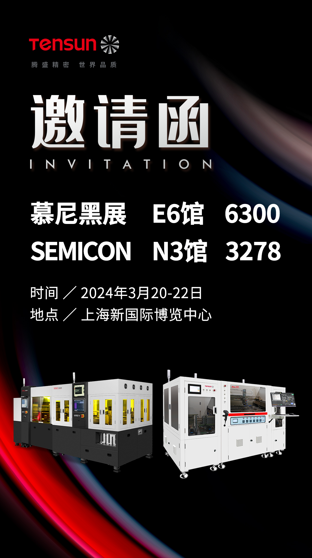 進入3月,將有兩場展會同時邂逅滬上,一是慕尼黑上海電子生產設備展(productronica China),一個是中國半導體展覽會(SEMICON China),兩大展會都將于2024年3月20-22日在上海新國際博覽中心同步舉行,屆時,Tensun騰盛將攜主流設備重磅亮相E6館6300展位、N3館3278展位,最新的技術交流、有趣的打卡互動,歡迎大家前來觀展交流。