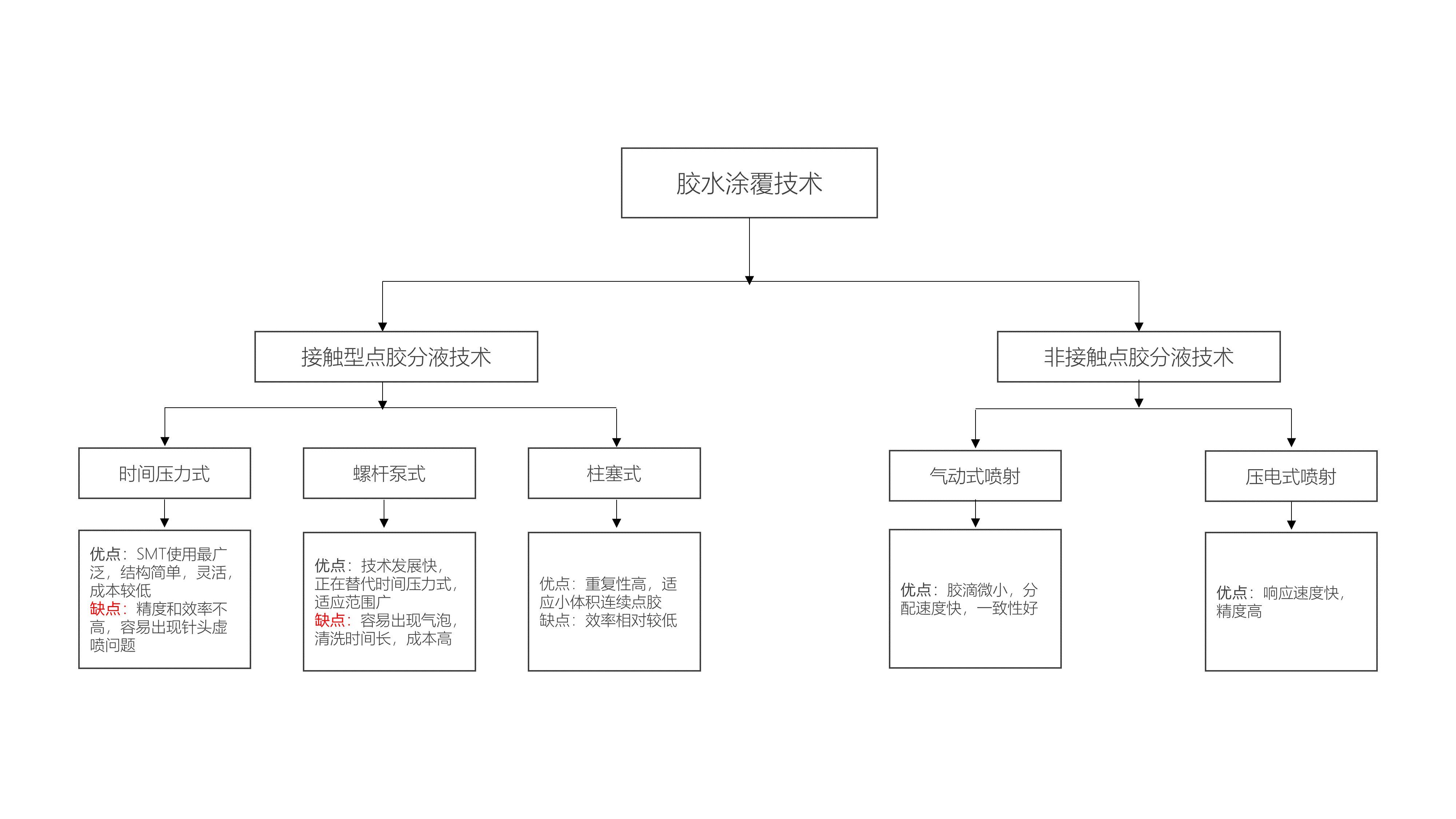微電子封裝工業(yè)中主要有點、線、面三種點膠涂覆技術,即可分為接觸式點膠、非接觸式點膠。
