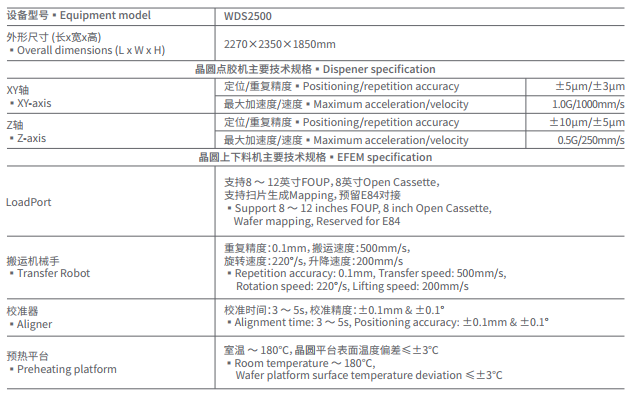 超精密晶圓級封裝點膠,兼容8~12英寸Wafer,重復(fù)定位精度±3μm。